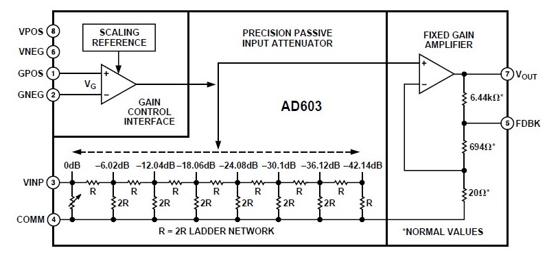 The AD603AR is a low noise, voltage-controlled amplifier for use in RF and IF AGC systems. It provides accurate, pin selectable gains of –11 dB to +31 dB with a bandwidth of 90 MHz or +9 dB to +51 dB with a bandwidth of 9 MHz. Any intermediate gain range may be arranged using one external resistor. The AD603AR can drive a load impedance as low as 100 W with low distortion. For a 500 W load in shunt with 5 pF, the total harmonic distortion for a ±1 V sinusoidal output at 10 MHz is typically –60 dBc. The applications of the AD603AR include: RF/IF AGC Amplifier, Video Gain Control, A/D Range Extension, Signal Measurement.