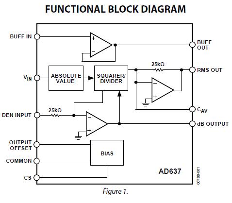 The AD637JQ is a complete, high accuracy, monolithic rms-to-dc converter that computes the true rms value of any complex waveform. It offers performance that is unprecedented in integrated circuit rms-to-dc converters and comparable to discrete and modular techniques in accuracy, bandwidth, and dynamic range. A crest factor compensation scheme in the AD637JQ permits measurements of signals with crest factors of up to 10 with less than 1% additional error. The wide band-width of the AD637JQ permits the measurement of signals up to 600 kHz with inputs of 200 mV rms and up to 8 MHz when the input levels are above 1 V rms.